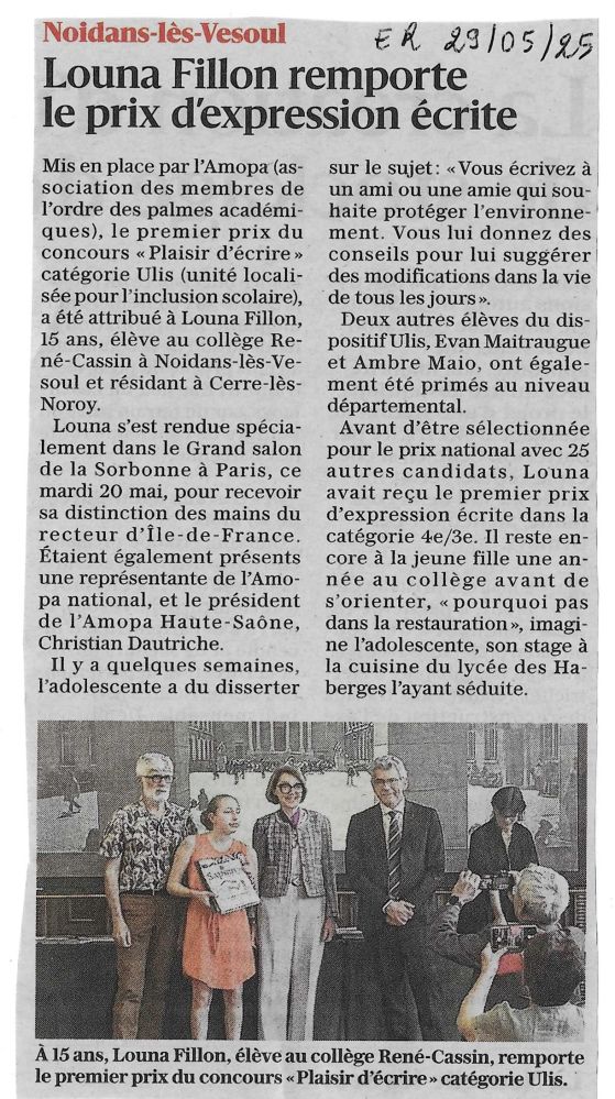 Louna FILLON, élève de 4ème au collège René Cassin de Noidans-les-Vesoul, a obtenu le premier prix national pour le concours "Plaisir d'écrire" dans la catégorie des classes ULIS (Unité Localisée pour l'Inclusion Scolaire).